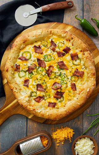 Sprinkle Mozzarella and Cheddar over the ranch dressing. Top with bacon and jalapeños.