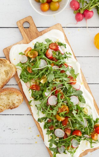- Artfully and gently lay the salad components over the whipped Ricotta and serve immediately.