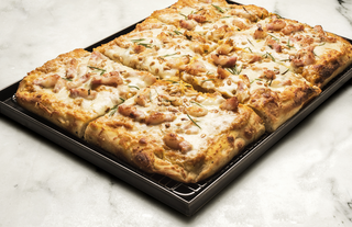 Spread pumpkin puree on shell, add guanciale, grated Parmesan, rosemary, and Mozzarella. Bake until melted.