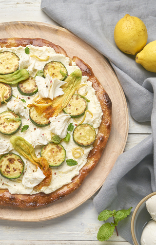 Arrange zucchini slices, fried zucchini flowers, and torn Ovoline on the pizza.