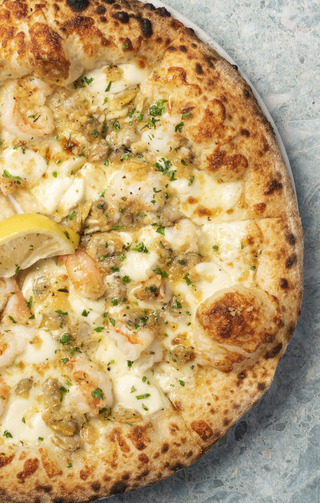 6. Spread the clams and shrimp around the pie and sprinkle oregano on top.